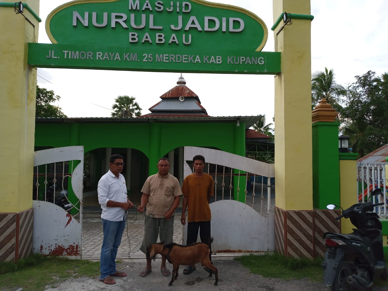Anggota DPRD Kabupaten Kupang, Mesak Mbura, S.H., yang akrab disapa Bapa Mese, dengan penuh rasa syukur menyerahkan hewan qurban berupa satu ekor kambing kepada Pengurus Qurban Masjid Nurul Jadid.