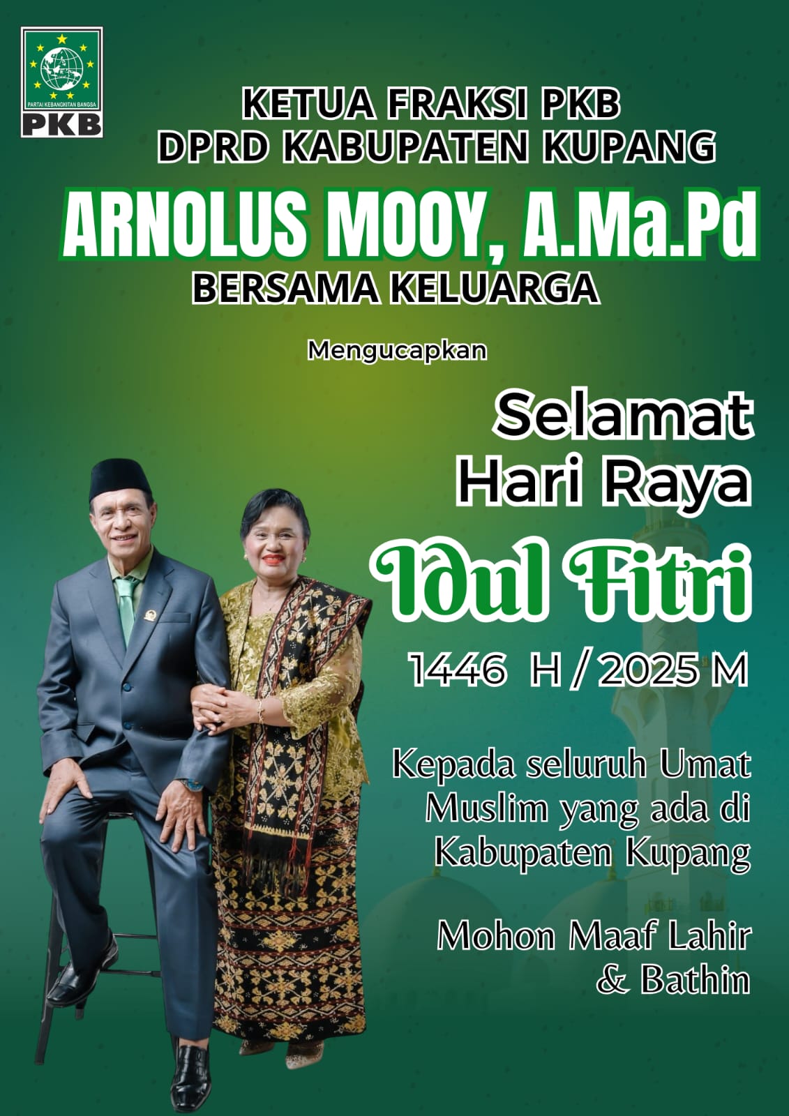 Arnolus Mooy, Ketua Fraksi PKB, DPRD Kabupaten Kupang bersama Keluarga Mengucapkan Selamat Idul Fitri 2025! Mohon maaf lahir dan batin. Semoga berkah dan kebahagiaan selalu menyertai.