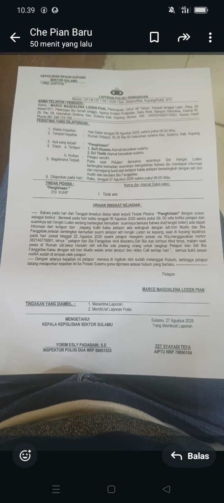 Laporan informasi ini disampaikan (Senin, 29/9) melalui panggilan WhatsApp oleh Marche Pian, istrinya, yang menyebutkan adanya undangan dari Polsek untuk diminta keterangan.