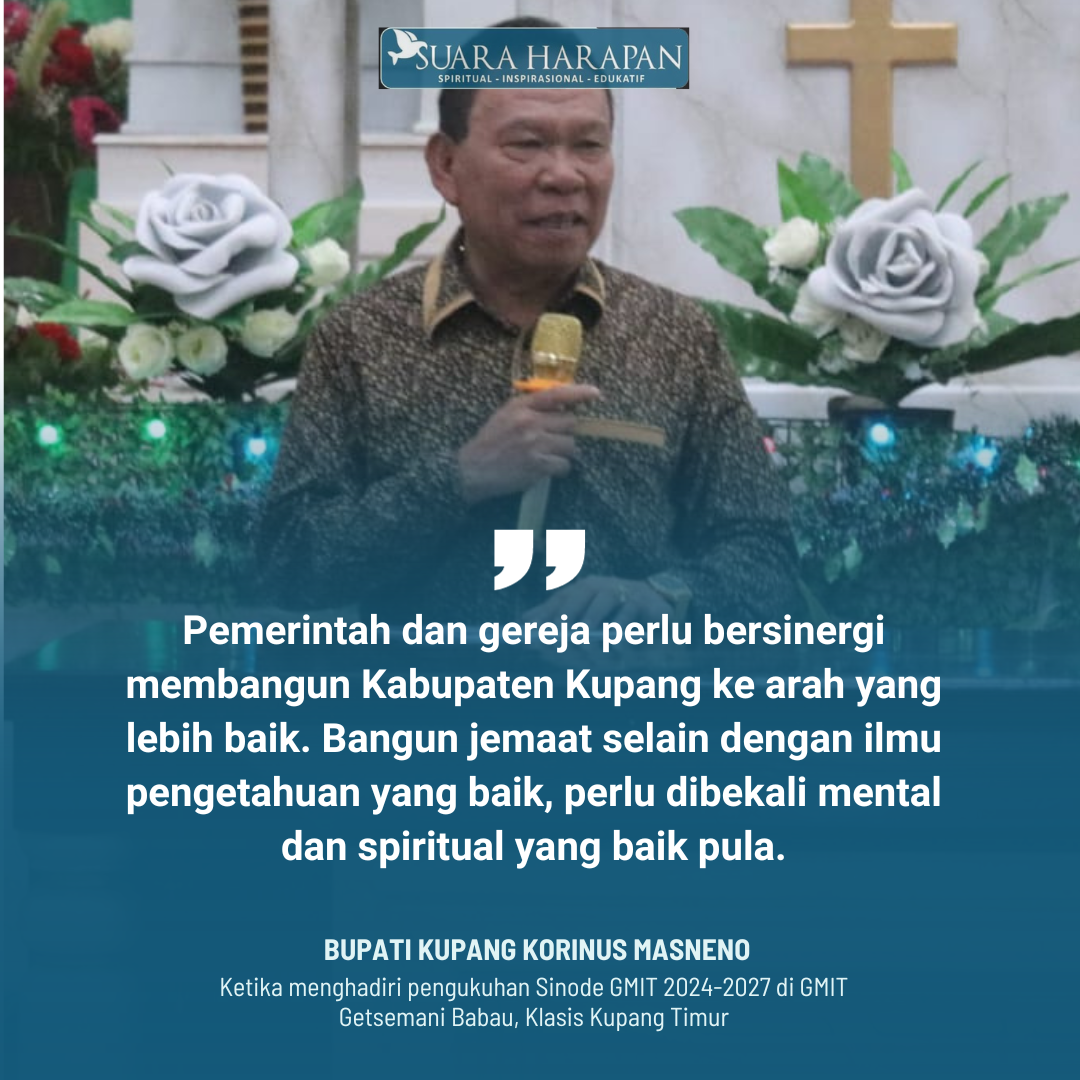 “Pemerintah dan gereja perlu bersinergi membangun Kabupaten Kupang ke arah yang lebih baik. Bangun jemaat selain dengan ilmu pengetahuan yang baik, perlu dibekali mental dan spiritual yang baik pula,” katanya.