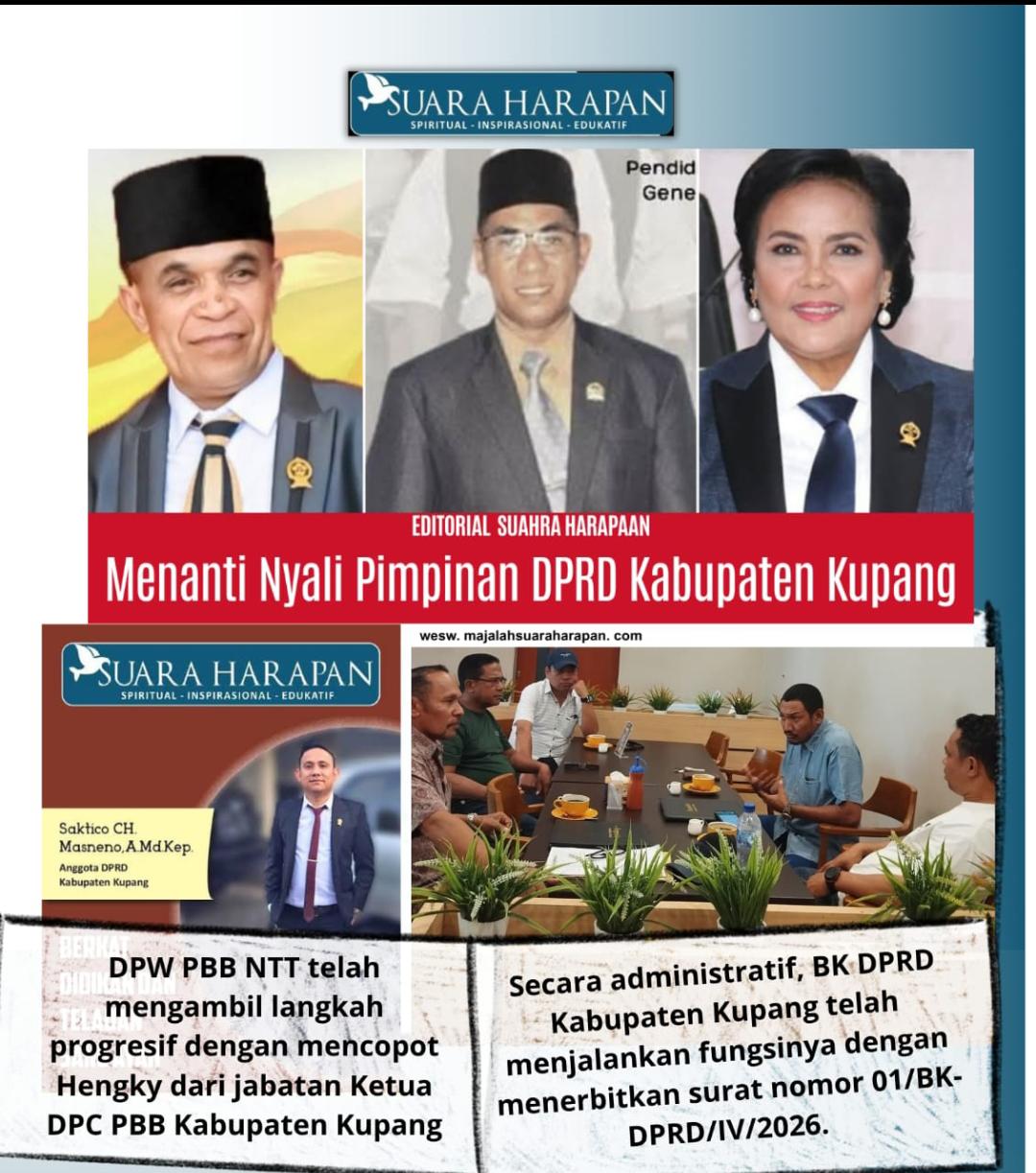 ​Media Suara Harapan mendesak Pimpinan DPRD Kabupaten Kupang untuk segera mengambil sikap tegas. Jangan biarkan gedung rakyat menjadi tempat berlindung bagi pelanggar etika. Keputusan harus segera diambil, bukan demi balas dendam, melainkan demi memulihkan kehormatan DPRD Kabupaten Kupang yang kini sedang dipertaruhkan.