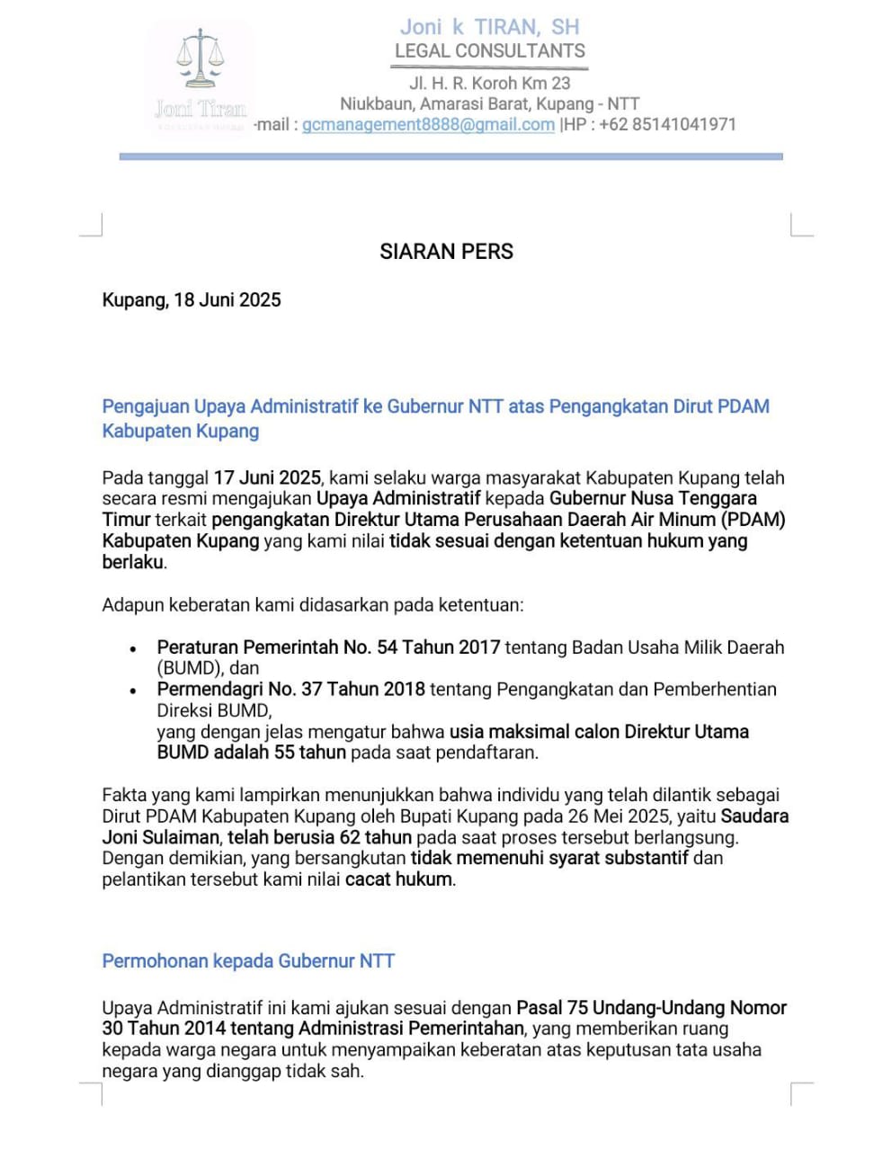 Majalah Suara Harapan – Warga Kabupaten Kupang mengajukan Upaya Administratif kepada Gubernur Nusa Tenggara Timur (NTT) terkait pengangkatan Direktur Utama Perusahaan Daerah Air Minum (PDAM) Kabupaten Kupang, Joni Sulaiman, yang dianggap tidak memenuhi syarat substantif karena berusia 62 tahun saat proses pengangkatan. Menurut Peraturan Pemerintah No. 54 Tahun 2017 dan Permendagri No. 37 Tahun 2018, usia maksimal calon Direktur Utama BUMD adalah 55 tahun.